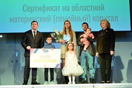 Чествование многодетных семей продолжилось вручением стотысячного сертификата на областной материнский капитал. Сертификат выдаётся при рождении третьего и последующих детей или при рождении одновременно трёх и более детей. Его обладателем стала семья Чавриковых из Сысертского района. Сегодня сумма превышает 167 тысяч рублей, деньги можно потратить на приобретение жилья или улучшение жилищных условий, на образование детей или на медицинские услуги для них. Эта мера поддержки действует с 2011 года.