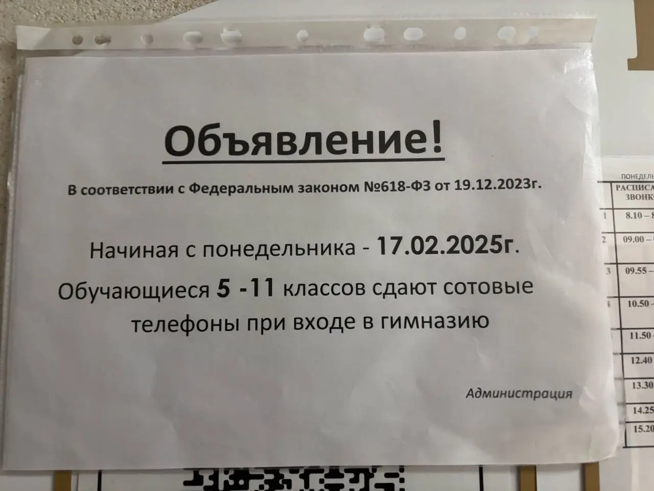 Такое объявление появилось в школе. Фото / Читатель Ревда-инфоВ Федеральном законе №618, на который ссылаются в «Еврогимназии» сказано, что телефоны запрещены «во время проведения учебных занятий при освоении образовательных программ начального общего, основного общего и среднего общего образования». Исключение — экстренные случаи. Как применять правила, должна решить каждая школа самостоятельно. При этом радикальных запретов — в виде требования сдавать смартфоны на входе в школу — в законе нет.