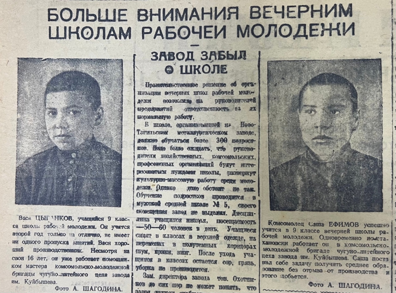 Во время Великой Отечественной войны многие подростки заменили на производстве тех, кто ушел на фронт, и вынуждены были бросить учебу. Чтобы ребята смогли получить 7-летнее образование, стали востребованы вечерние школы при заводах и фабриках. В Тагиле открыли 16 учреждений для рабочей молодежи. В них должно было учиться свыше 2000 подростков. В местной многотиражке подчеркивают, сколько усилий и труда приложили отделы кадров промышленных предприятий и отделы народного образования для того, чтобы укомплектовать школы учащимися и педагогами. В одном из февральских выпусков «Тагильского рабочего» подростки рассказывают об учебе. Так, Маргарита Лангер жила в Макеевке, на Донбассе, училась в 5 классе. Её старшие братья ушли на фронт, а она с мамой эвакуировалась в Нижний Тагил. Здесь устроилась в типографию и поступила в 6 класс вечерней школы рабочей молодежи. Учится только на отлично и хорошо.