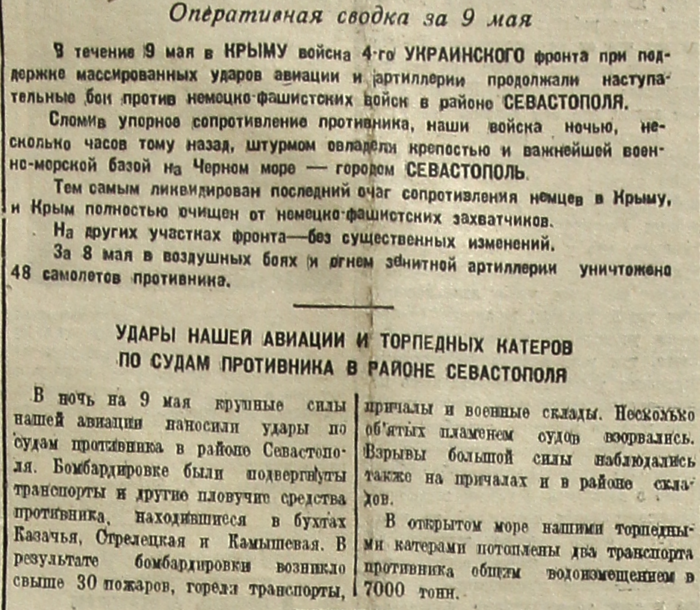 «В течение 9 мая в Крыму войска 4-го Украинского фронта при поддержке массированных ударов авиации и артиллерии продолжали наступательные бои против немецко-фашистских войск в районе Севастополя. Сломив упорное сопротивление противника, наши войска ночью, несколько часов тому назад, штурмом овладели крепостью и важнейшей военно-морской базой на Черном море – городом Севастополь. Тем самым ликвидирован последний очаг сопротивления немцев в Крыму, и Крым полностью очищен от немецко-фашистских захватчиков».
