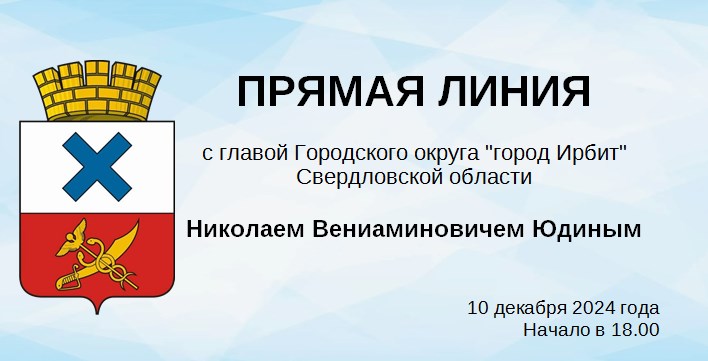 10 декабря 2024 года в 18.00 состоится прямая линия с главой Городского округа "город Ирбит" Свердловской области Николаем Вениаминовичем Юдиным.