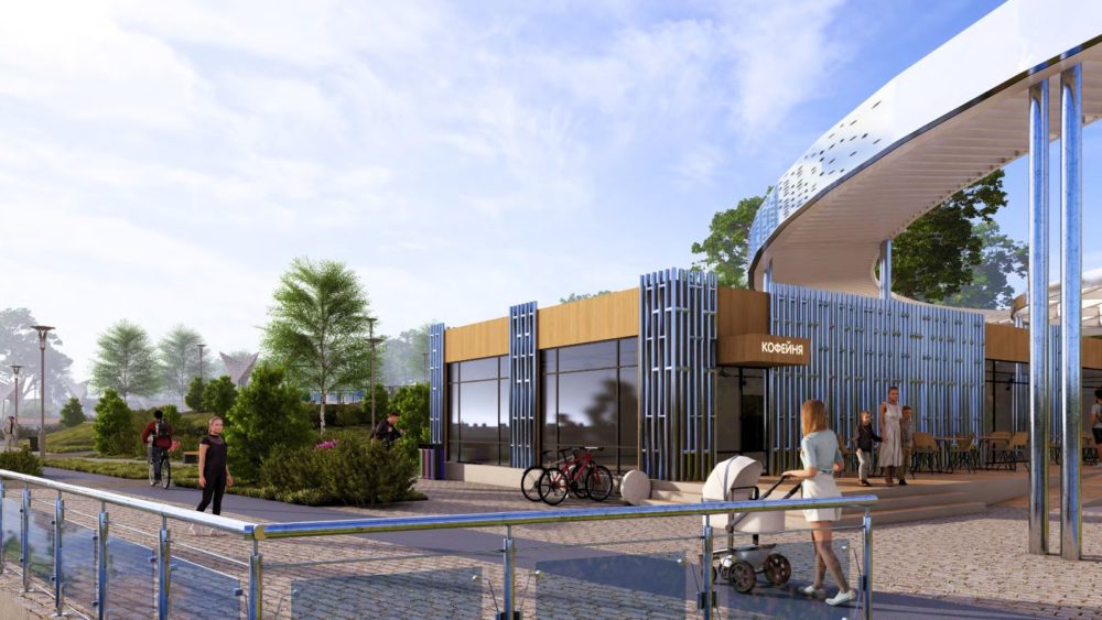 Концепция благоустройства территории подразумевает расположить на набережной различные зоны отдыха, детские и спортивные площадки, амфитеатр под крышей, мост и дорожки на опорах, причал, променад, парковки, торговые павильоны, музей на открытом воздухе, а также установить скамейки, урны, провести наружное освещение на территории и произвести посадку деревьев и кустарников.