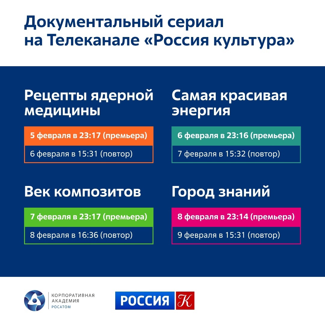 До 8 февраля на телеканале «Россия-Культура» идут показы документального сериала о Росатоме. Первые выпуски посвящены достижениям специалистов атомной отрасли в образовании, ядерной медицине, ветроэнергетике и композитных материалах.